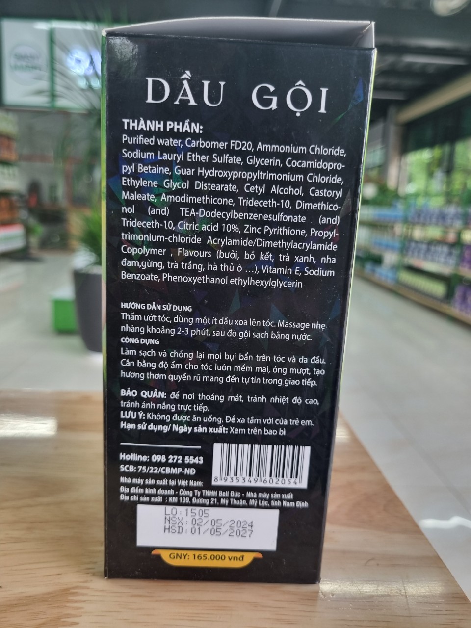 Purified water, Carbomer FD20, Ammonium Chloride, Sodium Lauryl Ether Sulfate, Glycerin, Cocamidopro- pyl Betaine, Guar Hydroxypropyltrimonium Chloride, Ethylene Glycol Distearate, Cetyl Alcohol, Castoryl Maleate, Amodimethicone, Trideceth-10, Dimethico- nol (and) TEA-Dodecylbenzenesulfonate (and) Trideceth-10, Citric acid 10%, Zinc Pyrithione, Propyl- trimonium-chloride Acrylamide/Dimethylacrylamide Copolymer, Flavours (bưởi, bố kết, trà xanh, nha đam, gừng, trà trắng, hà thủ ô …), Vitamin E, Sodium Benzoate, Phenoxyethanol ethylhexylglycerin