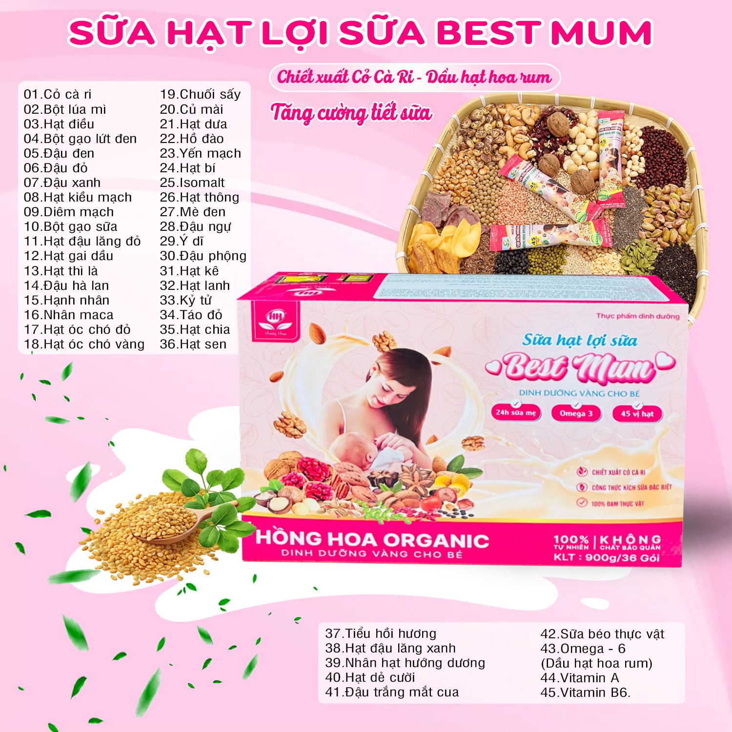 45 VỊ HẠT (1)Yến mạch, (2)bột lúa mì, (3)sữa béo thực vật, (4)bột gạo lứt đen, (5)đậu đen, (6)đậu đỏ, (7)đậu xanh, (8)hạt kiều mạch, (9)diêm mạch, (10)bột gạo sữa, (11) hạt đậu lăng đỏ, (12)hạt đậu lăng xanh, (13) đậu trắng mắt cua, (14) đậu hà lan, (15)hạnh nhân, (16)nhân maca, (17)nhân óc chó vàng, (18)nhân óc cho vàng, (19)chuối sấy, (20)củ mài, (21)hạt dẻ cười, (22)hồ đào, (23)cỏ cà ri, (24)tiểu hồi hương, (25)isomalt, (26)hạt thông, (27)mè đen, (28) đậu ngự, (29)ý dĩ, (30)đậu phộng, (31)nhân hướng dương, (32)hạt lanh, (33)kỷ tử, (34) táo đỏ, (35)hạt chia, (36)hạt sen, (37)hạt bí, (38) hạt gai dầu, (39) hạt kê, (40) hạt dưa, (41) thì là, (42)hạt điều, (43)Omega 6 (Bột dầu hoa rum), (44) Vitamin A, (45)Vitamin B6.